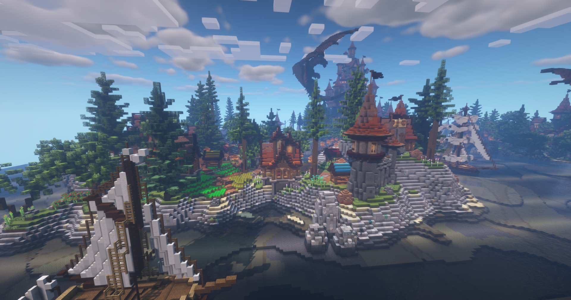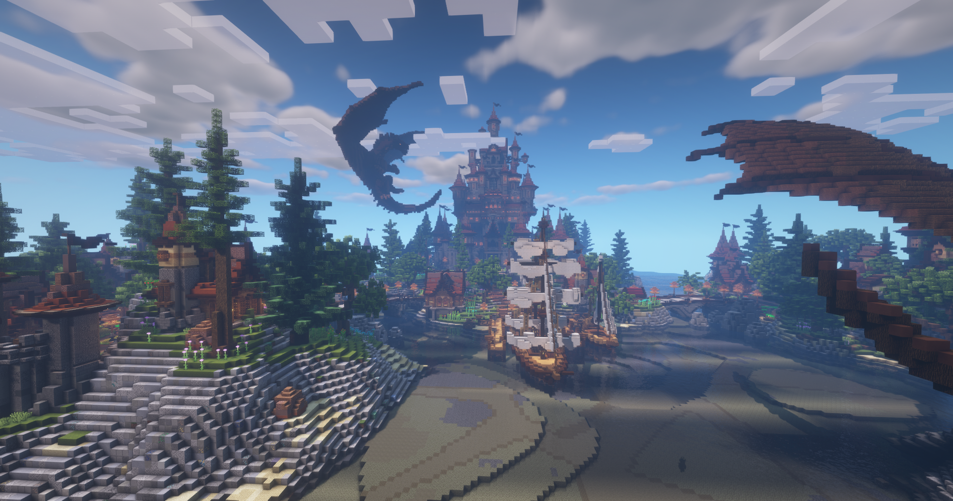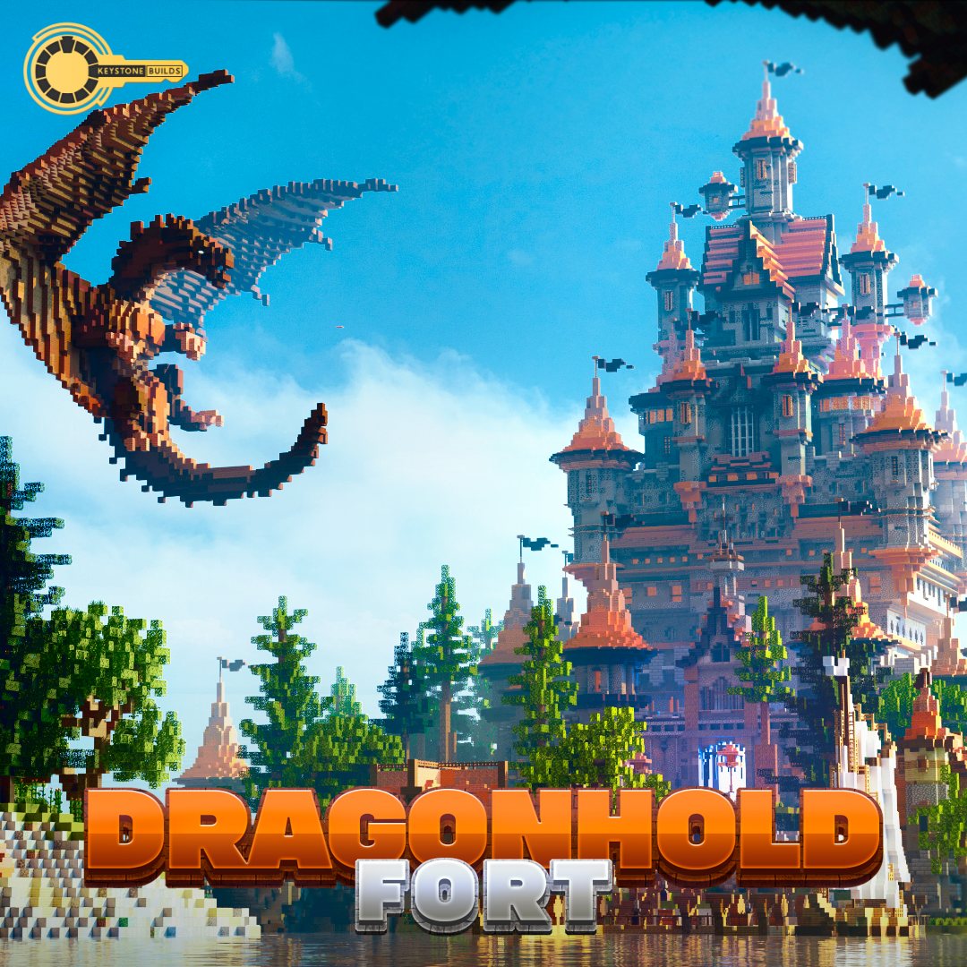Step into the epic dragondholf fort lobby, featuring a grand orange castle, two majestic dragon organics, and vibrant market areas with over 18 tents. Explore villages with interiors, bustling ports with ships, and expansive crop farms, all centered around a powerful portal., all compatible with Minecraft versions 1.8 through 1.18+.