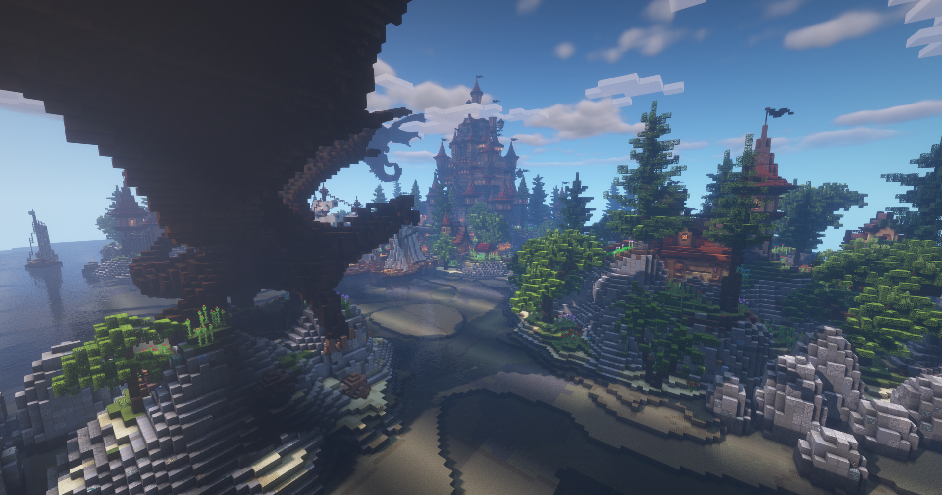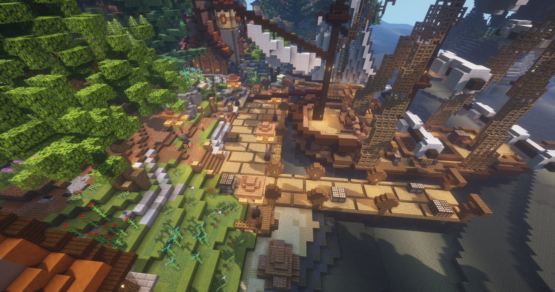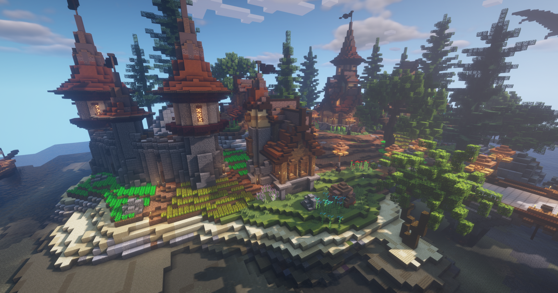 Step into the epic dragondholf fort lobby, featuring a grand orange castle, two majestic dragon organics, and vibrant market areas with over 18 tents. Explore villages with interiors, bustling ports with ships, and expansive crop farms, all centered around a powerful portal., all compatible with Minecraft versions 1.8 through 1.18+.