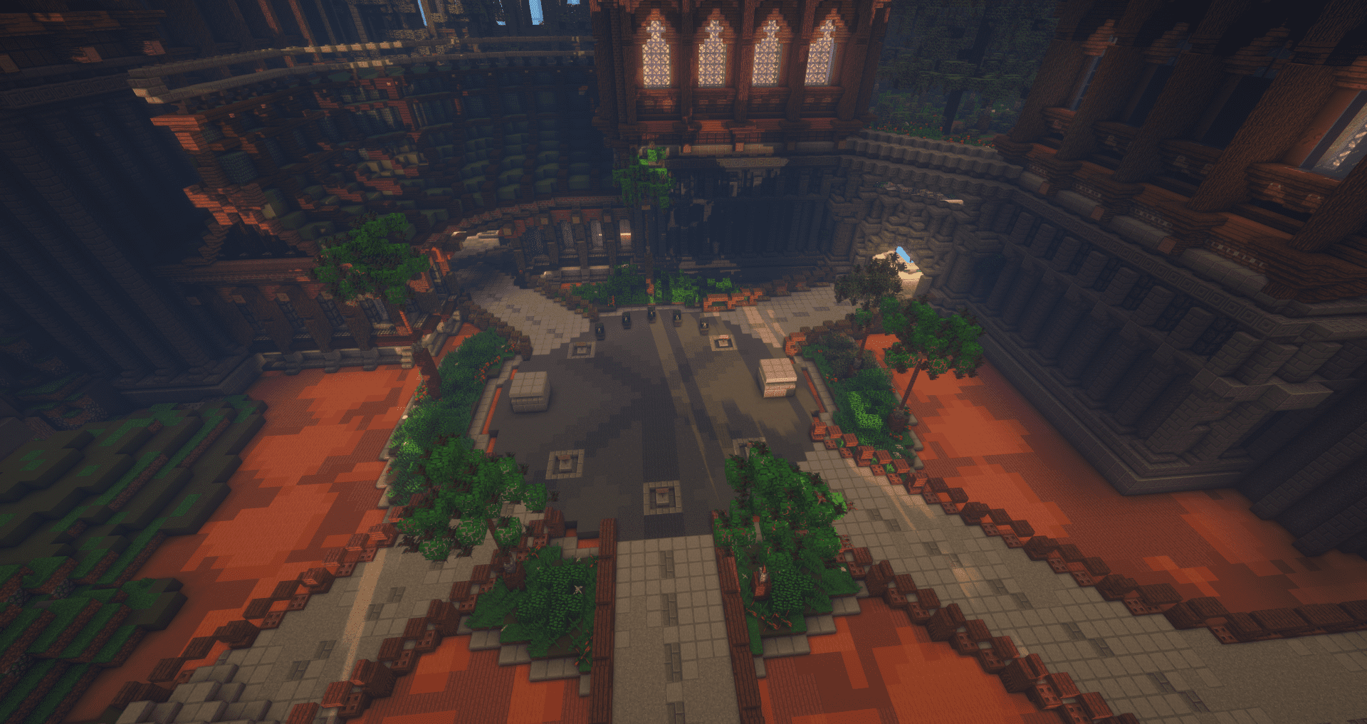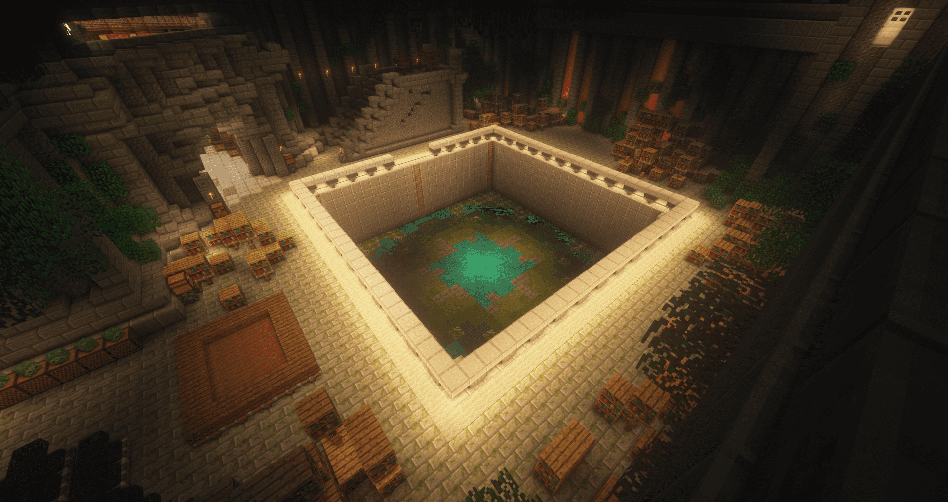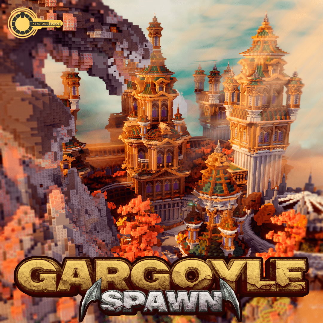 Immerse your players in a formidable setting with the "Gargoyle Spawn," a versatile 220x220 map designed for use as a lobby or spawn, featuring spaces for 5 NPCs, 5 crates, a farm area, an enchant area, and a Warzone colosseum, compatible with Minecraft versions 1.8 through 1.18+