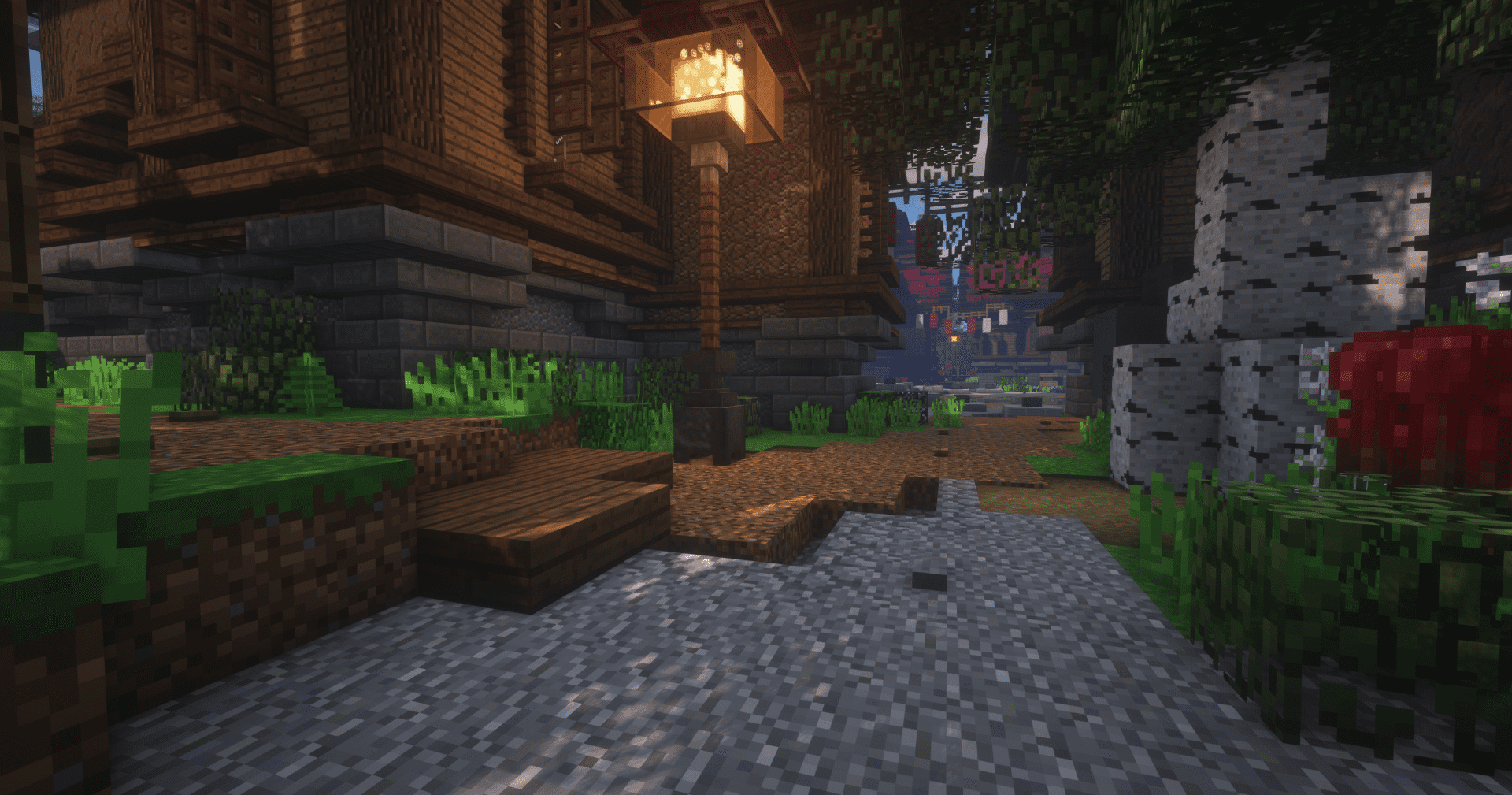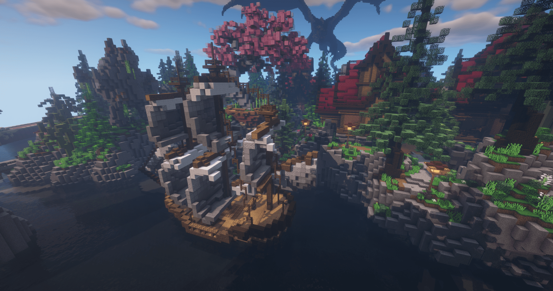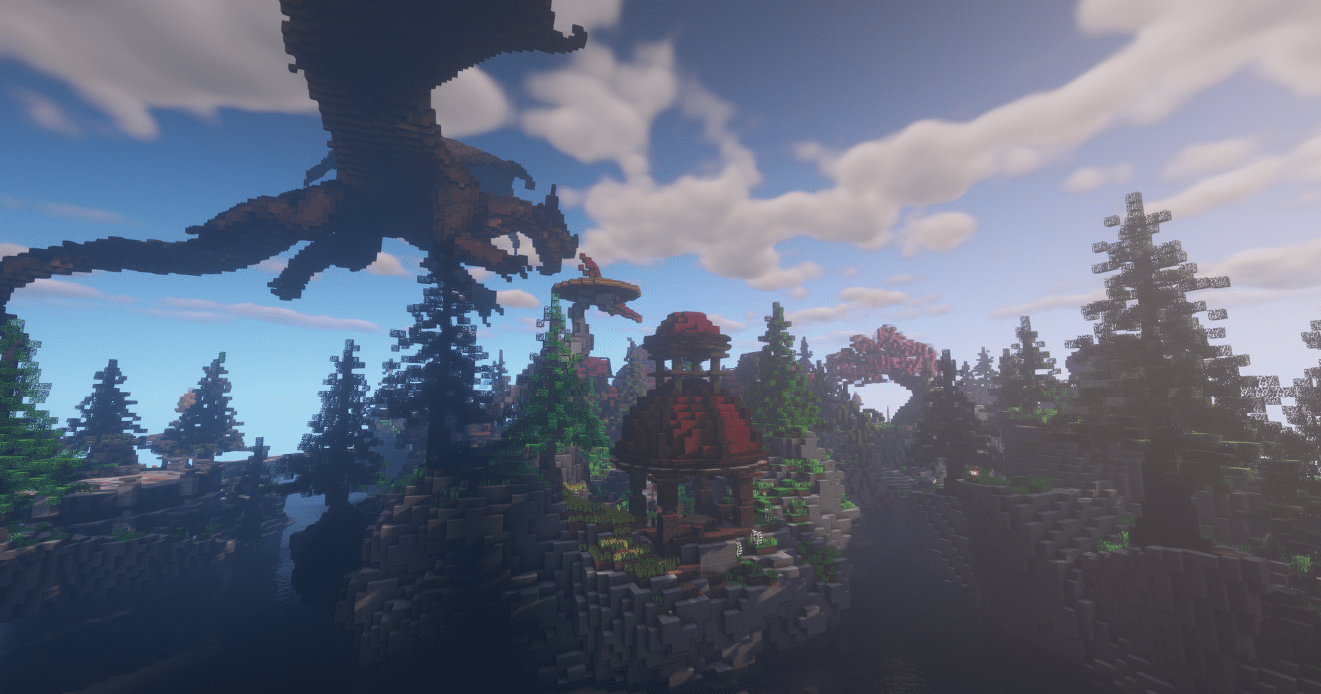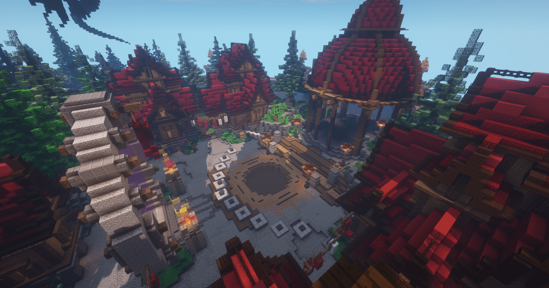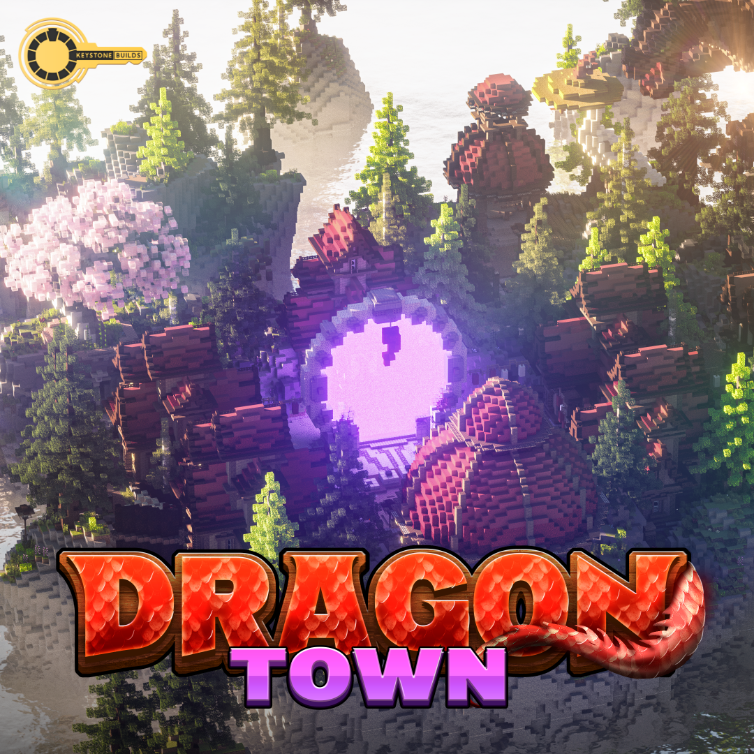 A stunning medieval village featuring a majestic dragon. This vibrant lobby includes space for 11 NPCs, a portal, crates area, and more, making it an ideal setting for any Minecraft world, compatible with versions 1.8 through 1.18+