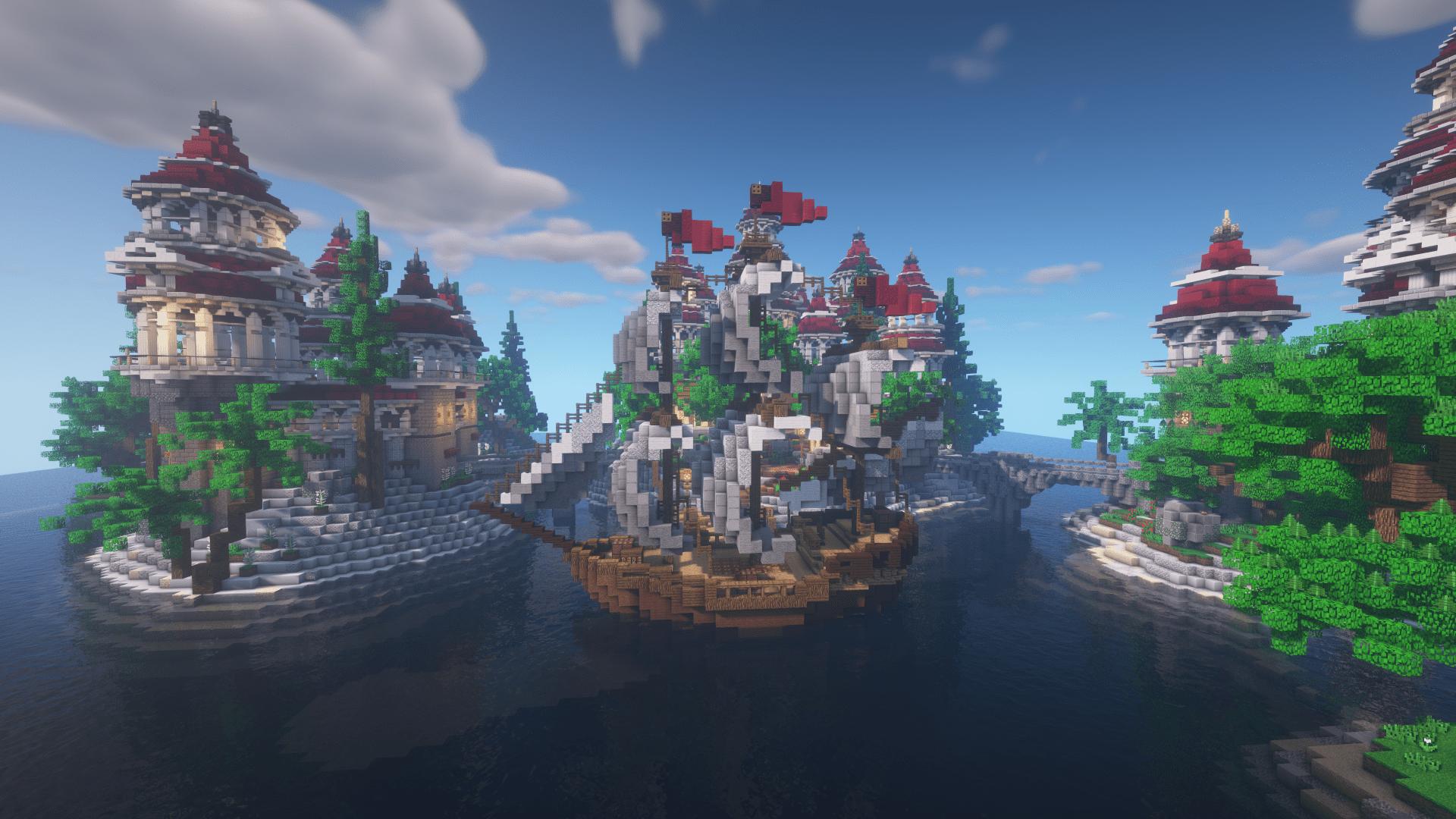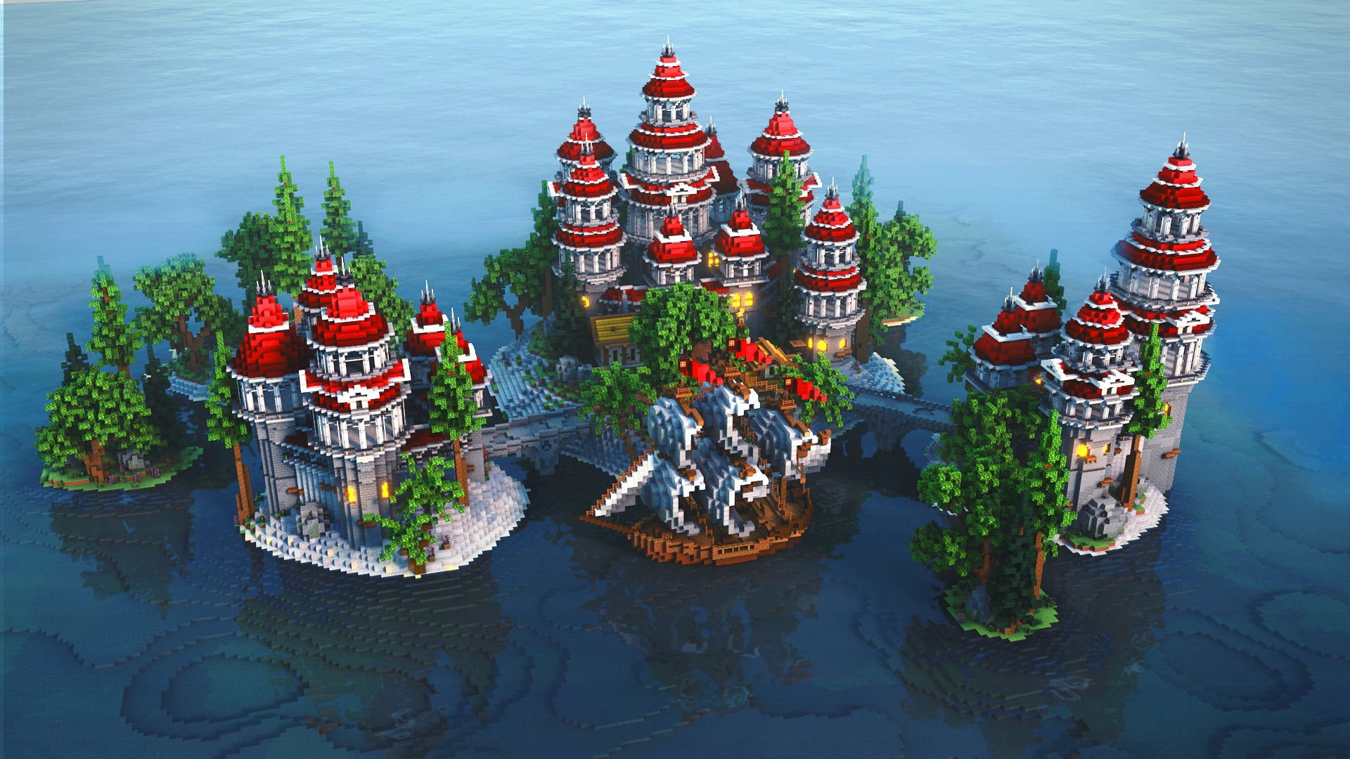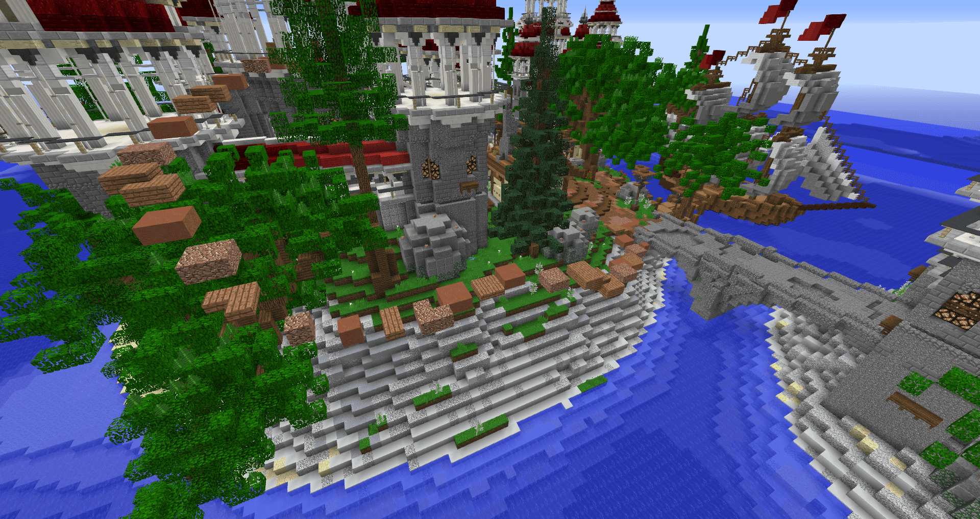 Island-based medieval kingdom featuring grand castles and a formidable ship, all compatible with Minecraft versions 1.8 through 1.18+